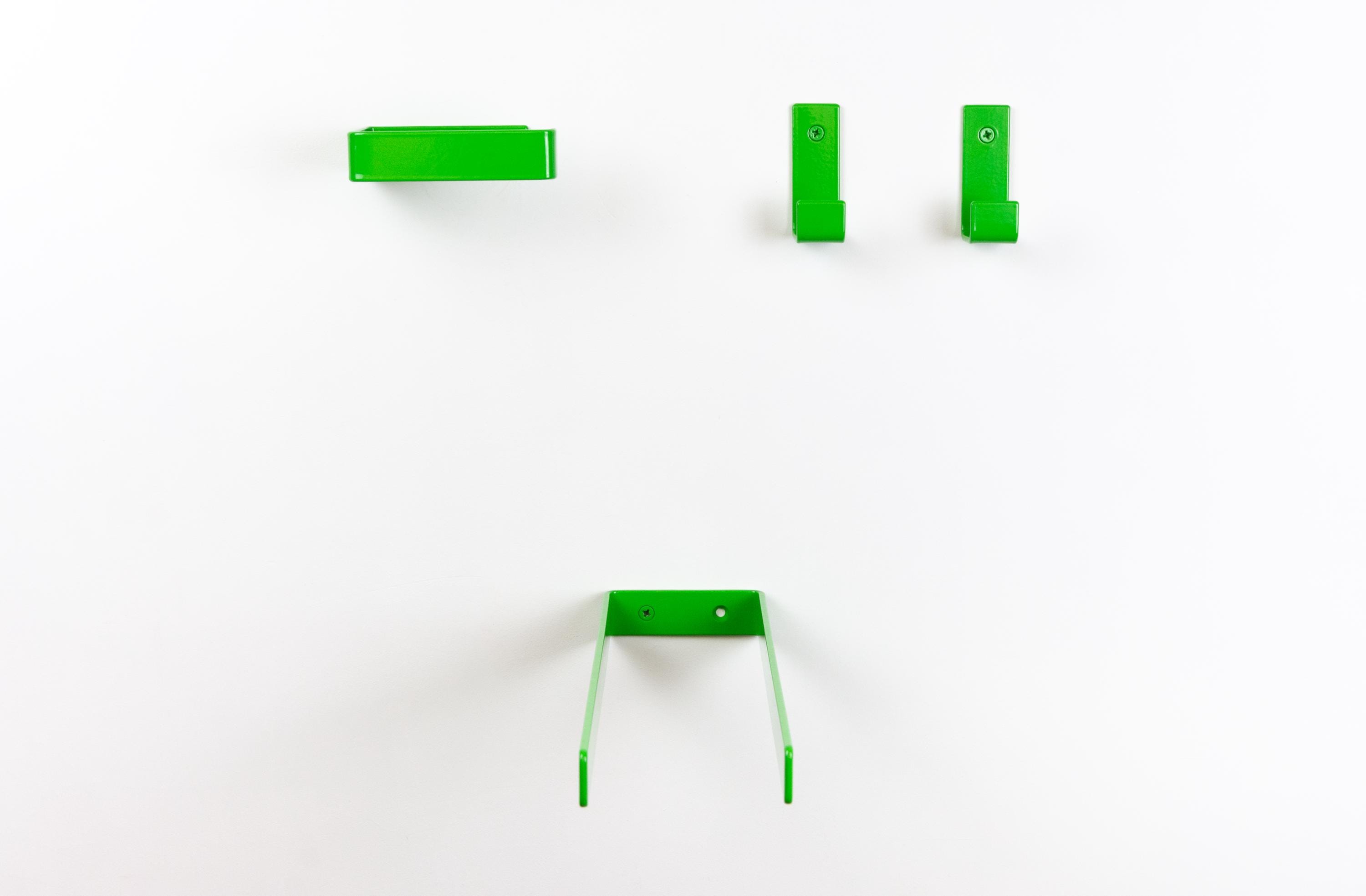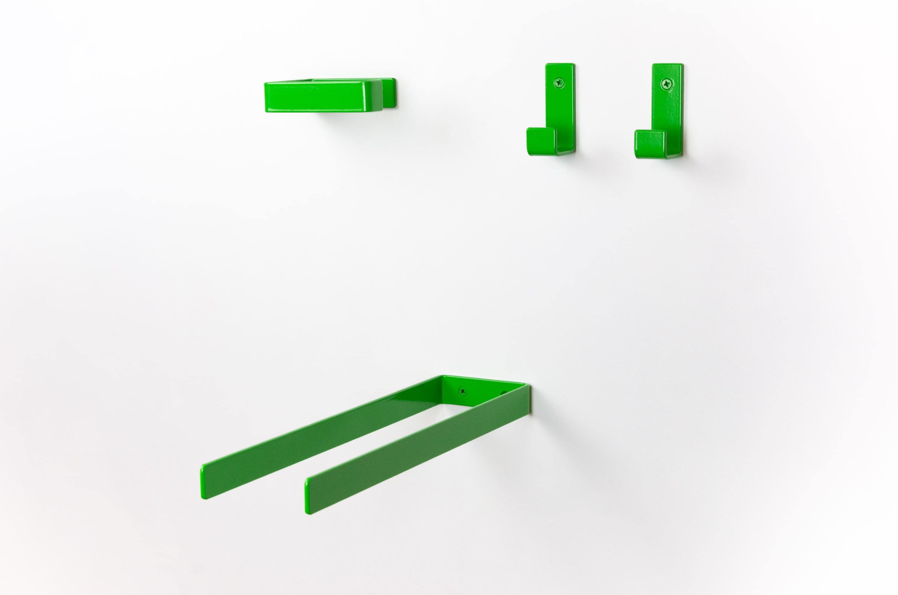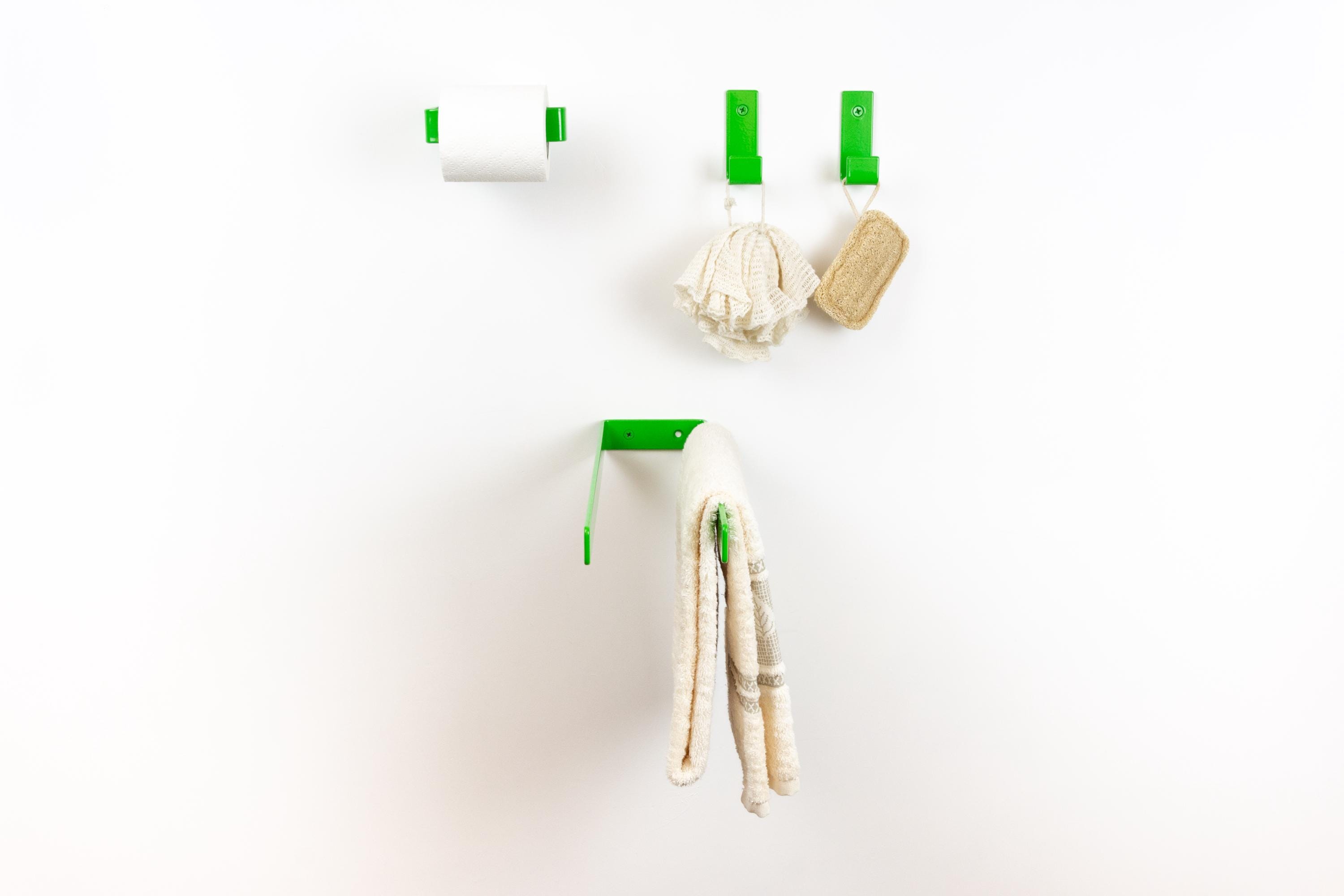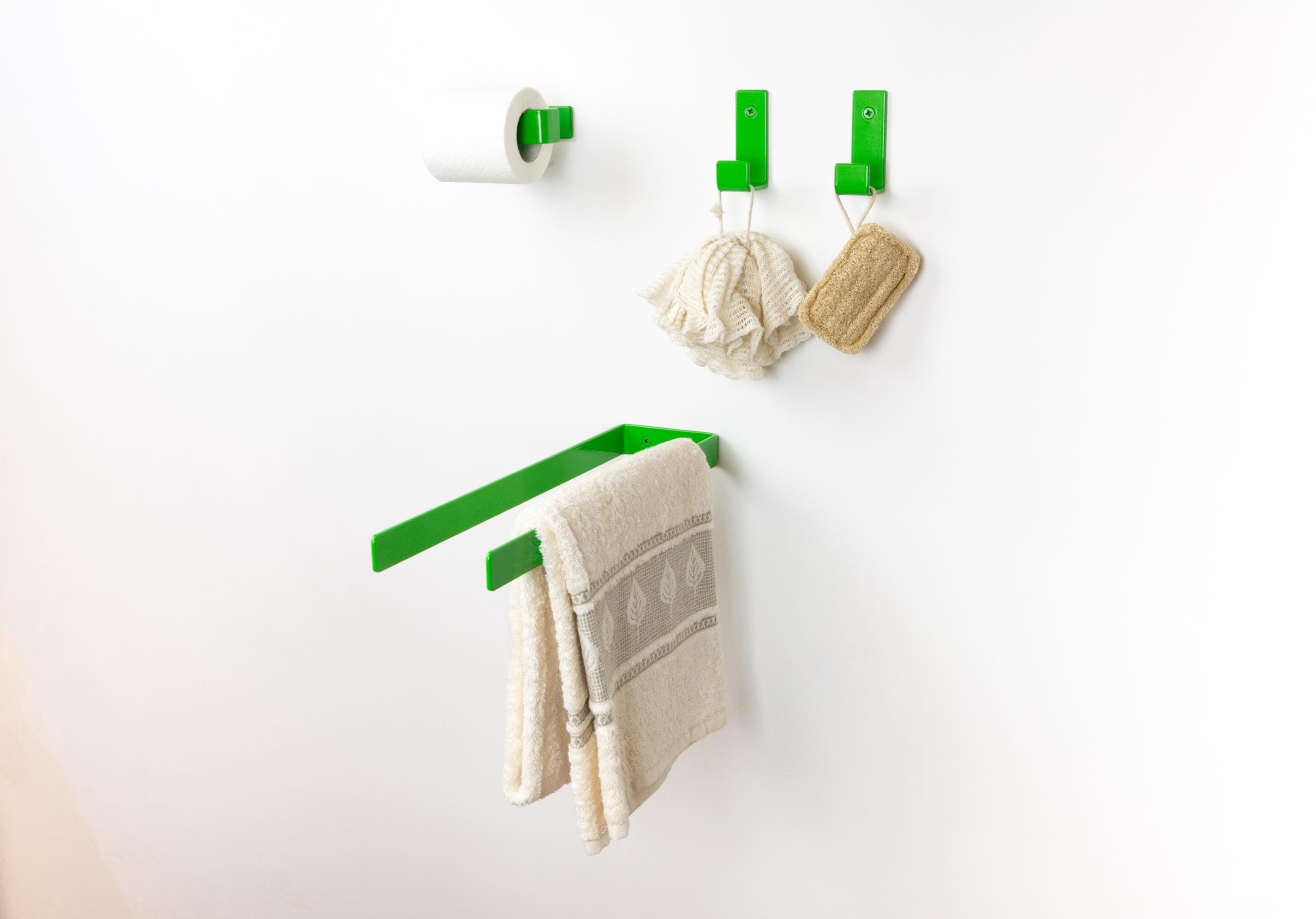Refresh your space with these bright bathroom accessories, featuring a toilet paper holder, towel holder or hook. You can easily create your own bathroom set by mix and matching the available style, colors and size to fit your home perfectly! Color of the items shown in the pictures is Green Gloss.