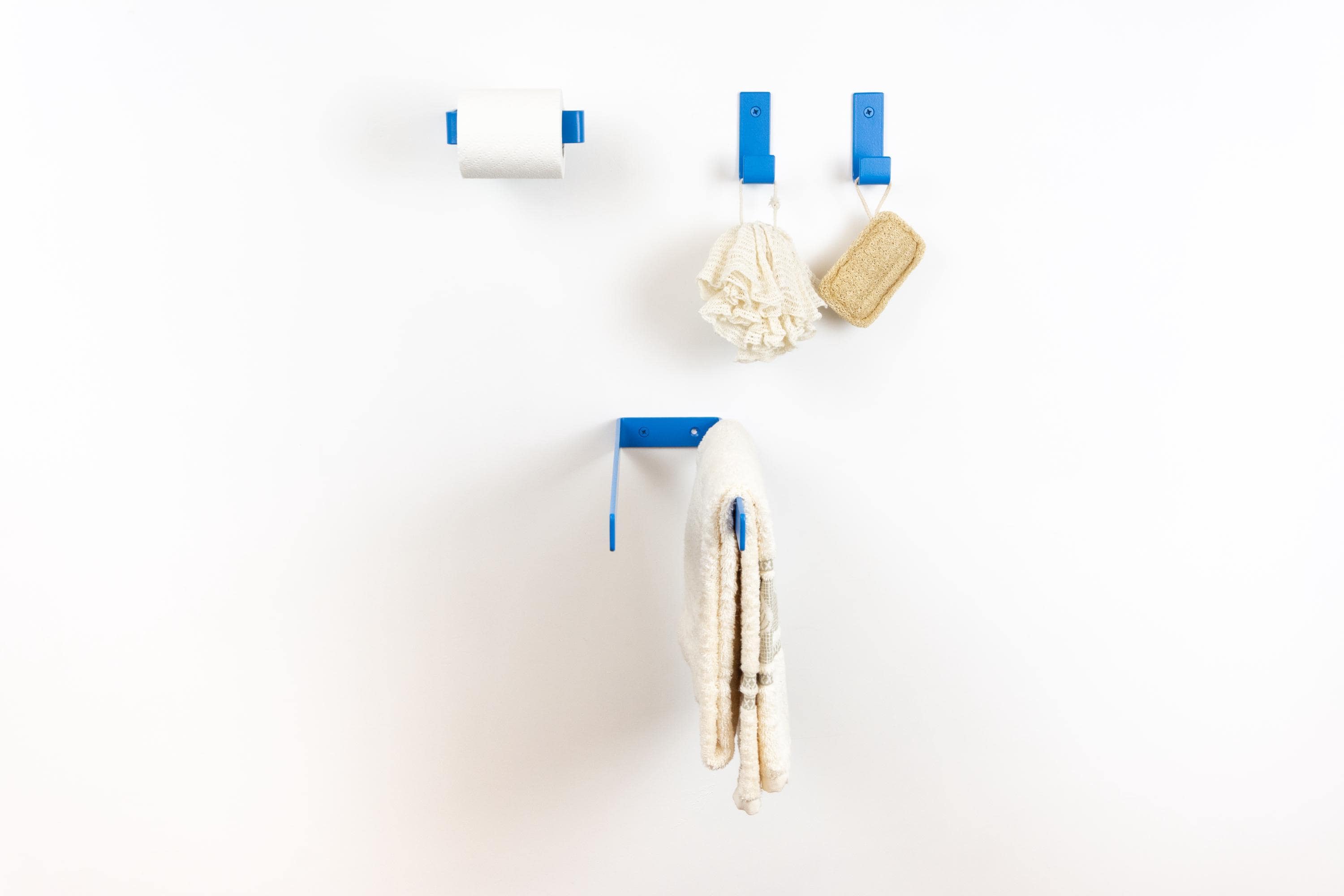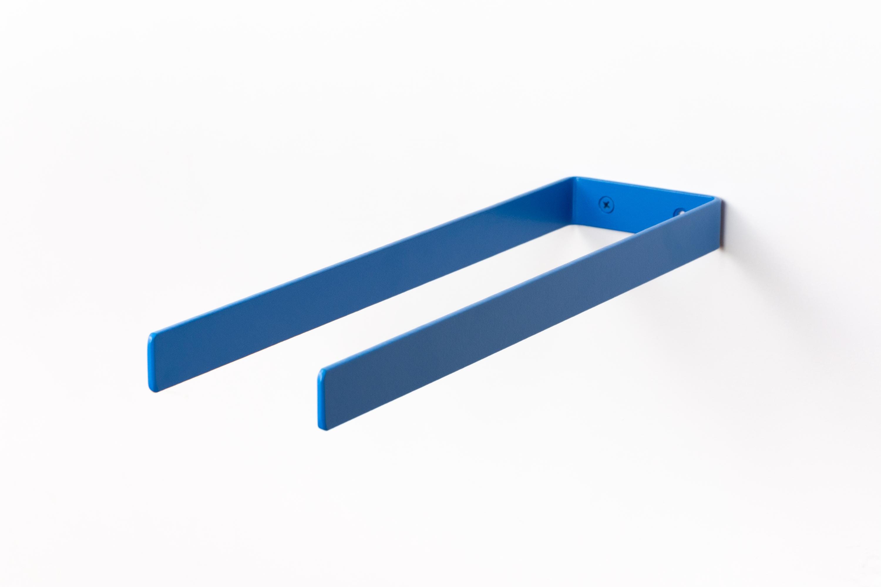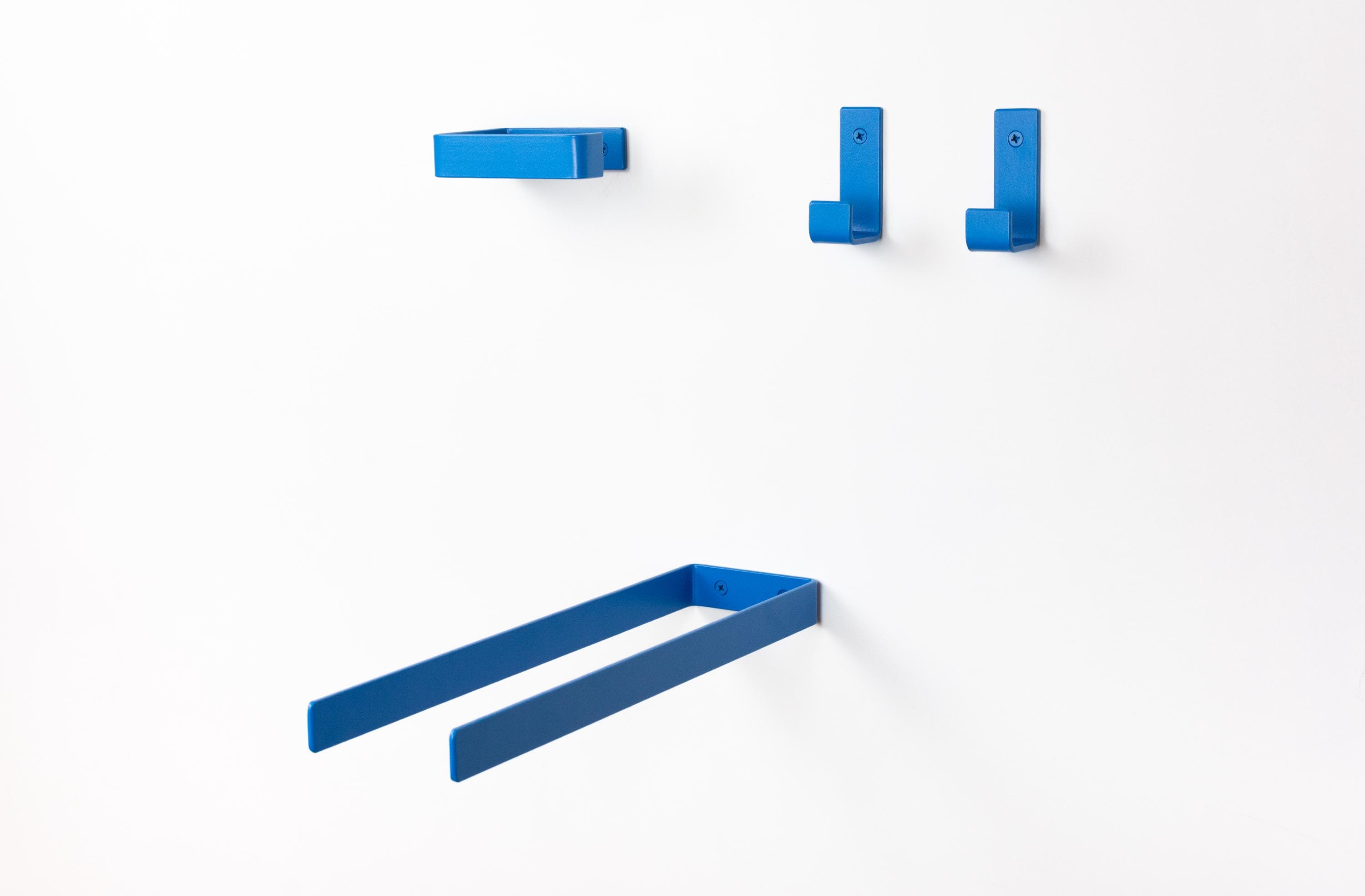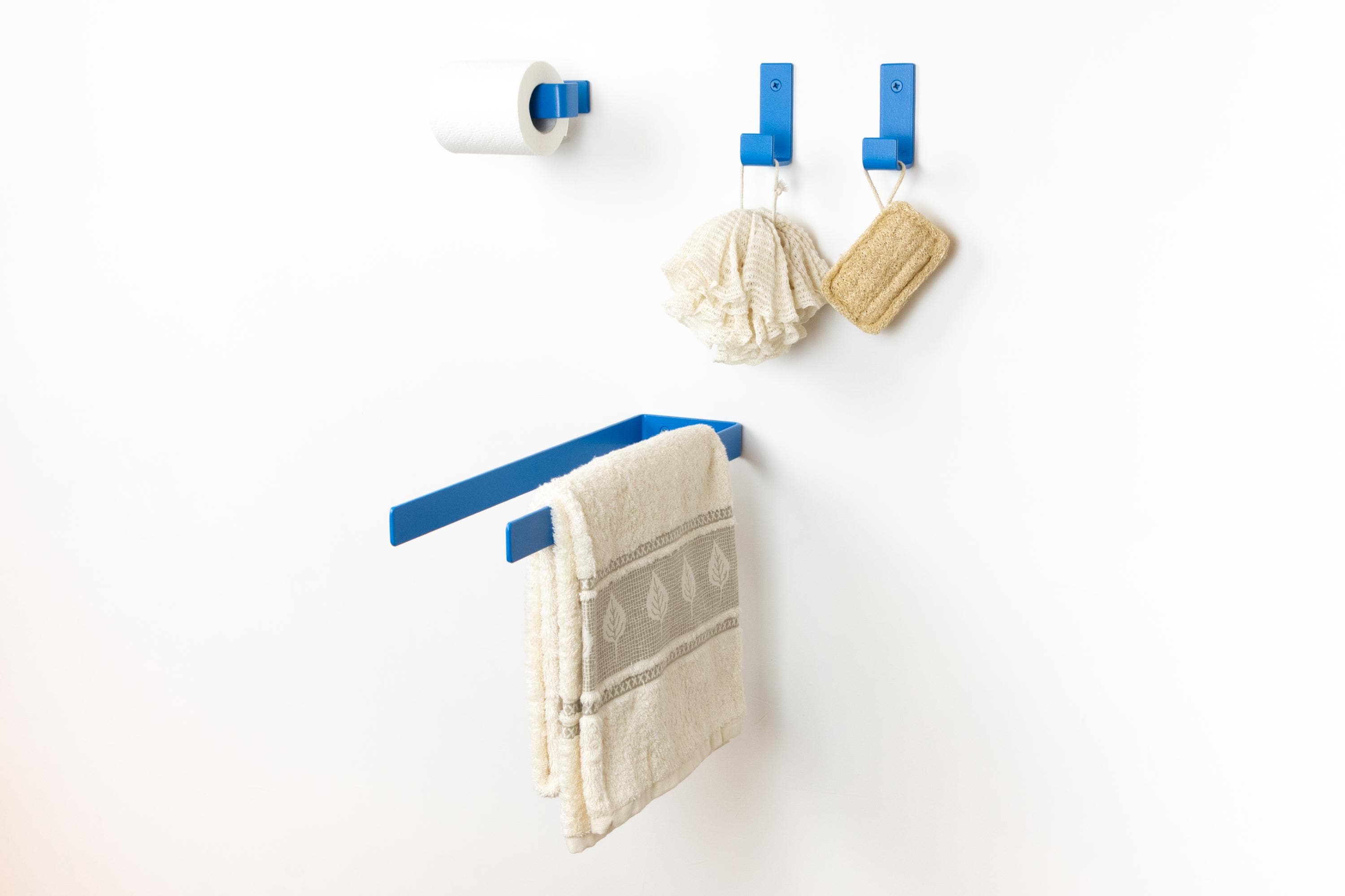 Elevate your space with these colorful bathroom accessories, featuring a toilet paper holder, towel holder or hook. Create your own bathroom set by mix and matching from our custom styles and colors to achieve the perfect look for your home! Color of the items shown in the pictures is Blue Matte.