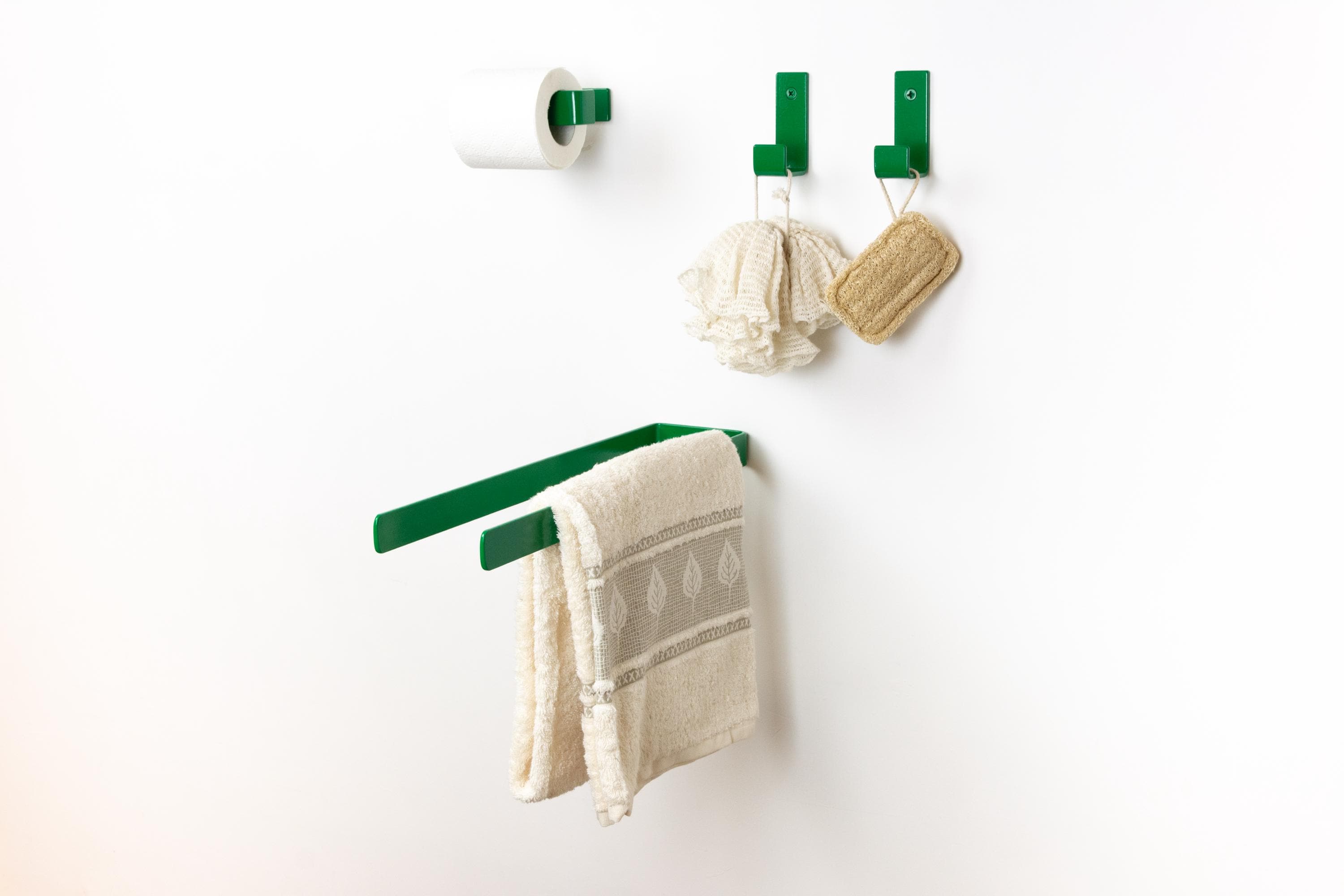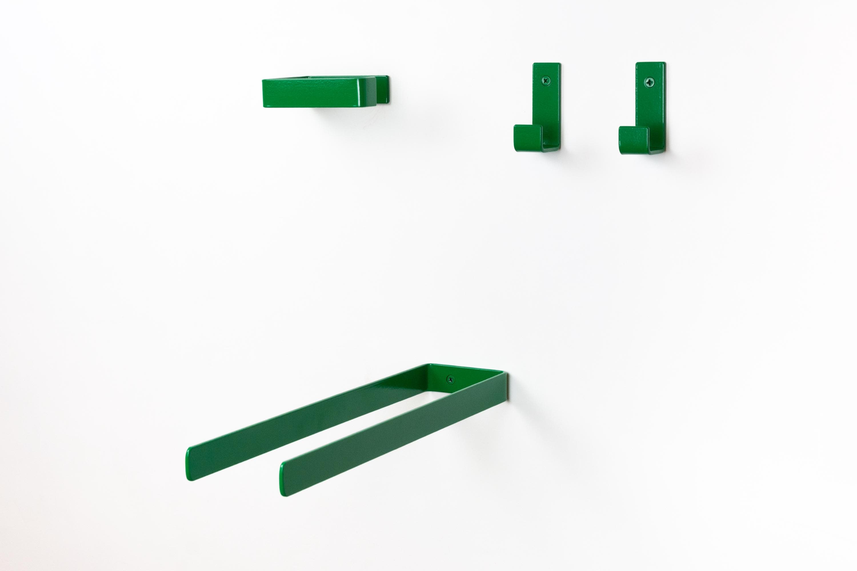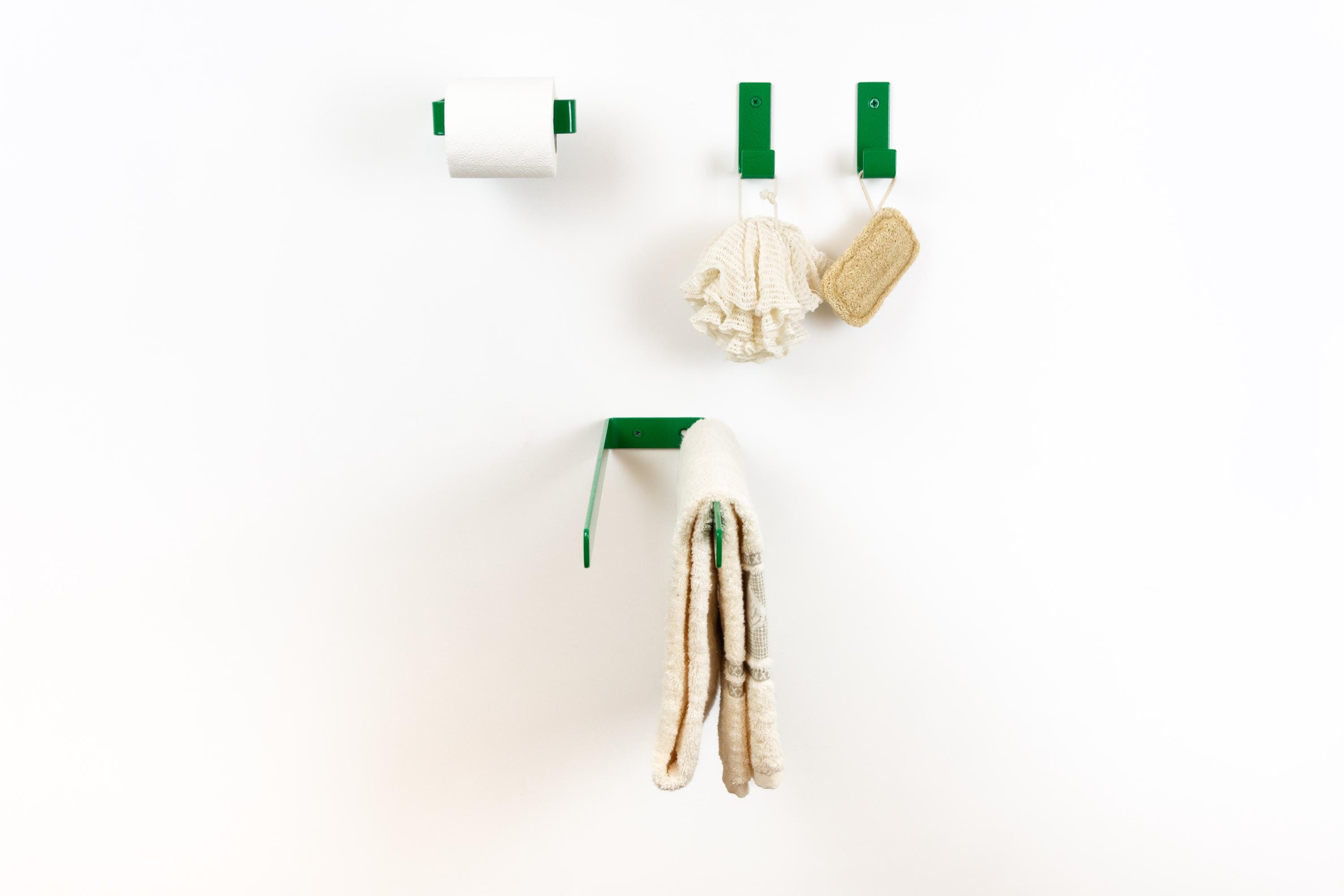 Personalize your space with these eclectic bathroom accessories: a toilet paper holder, towel holder or hook. Easily create your own bathroom set by mix and matching the custom color and style options to fit your unique vision! Color of the items shown in the pictures is Dark Green Gloss.
