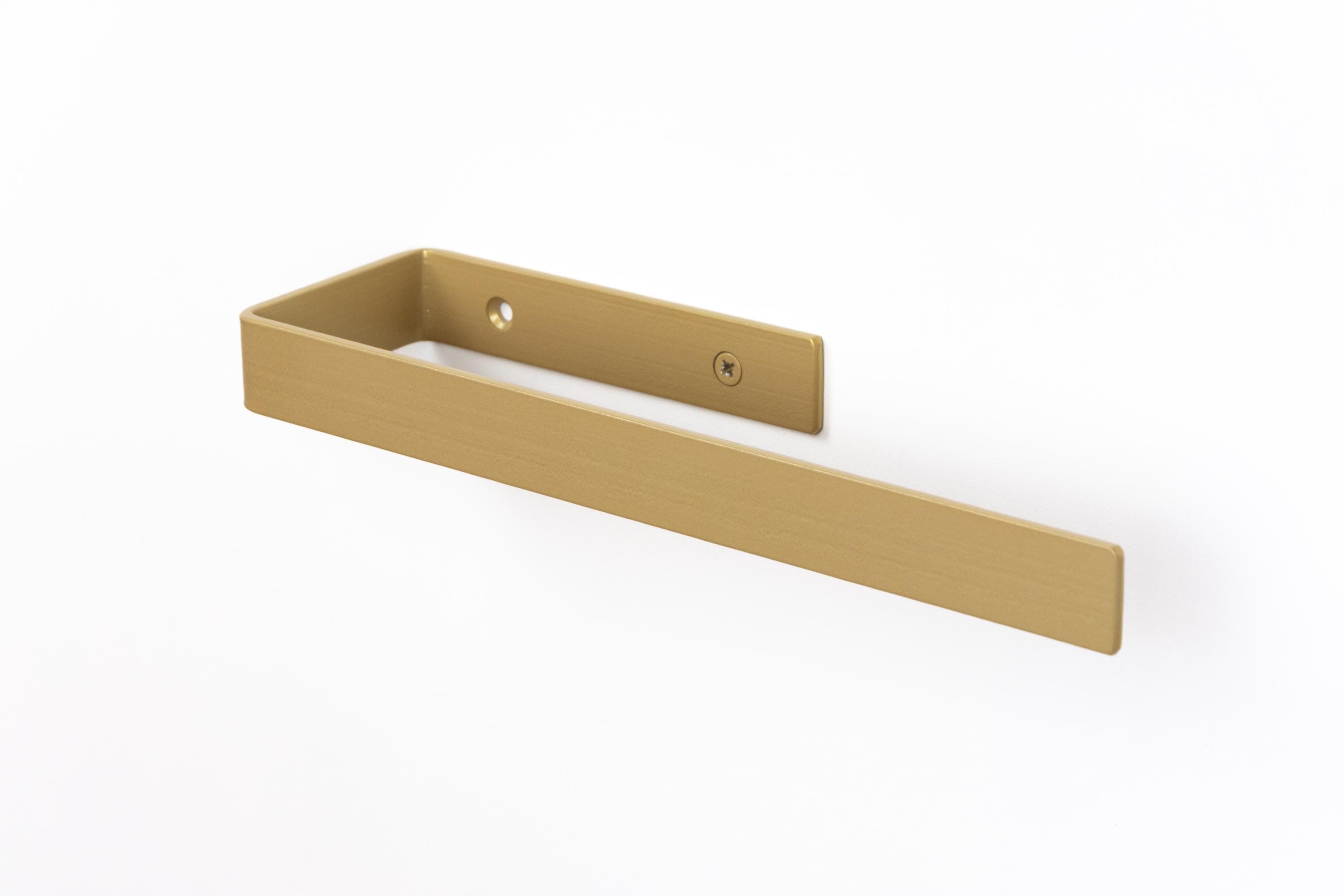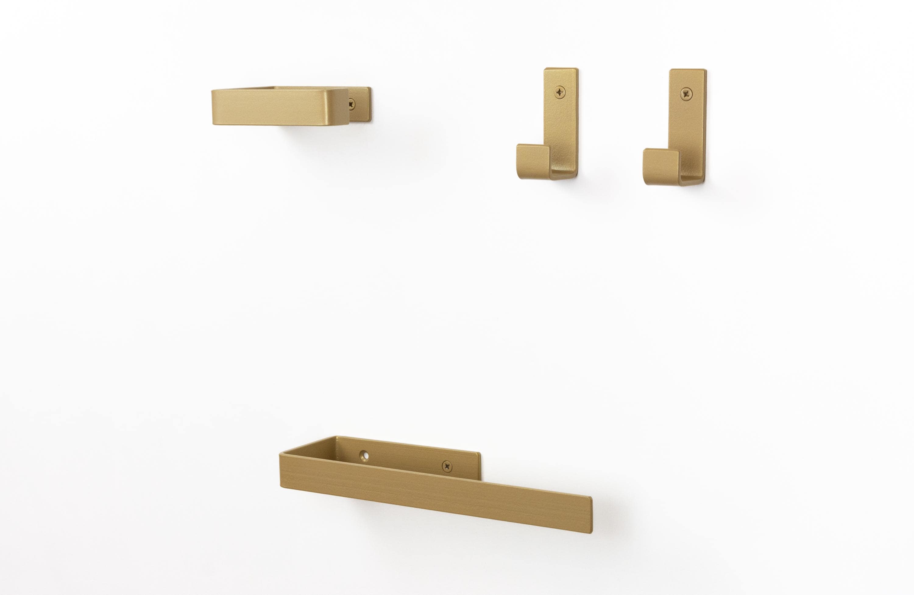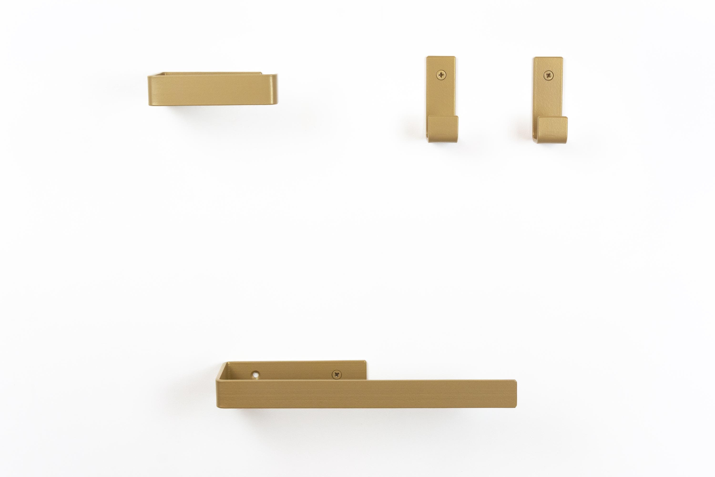 Upgrade your space with minimalist modern bathroom accessories and build your own set to fit your needs. This mix & match hardware collection allows you to select a toilet paper holder, towel holder or hook that perfectly complements your home! Color of the items shown in the pictures is Champagne Gold.